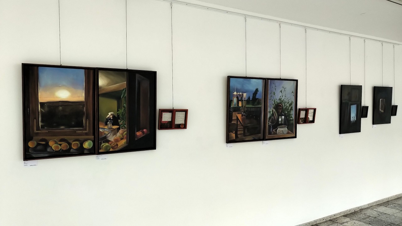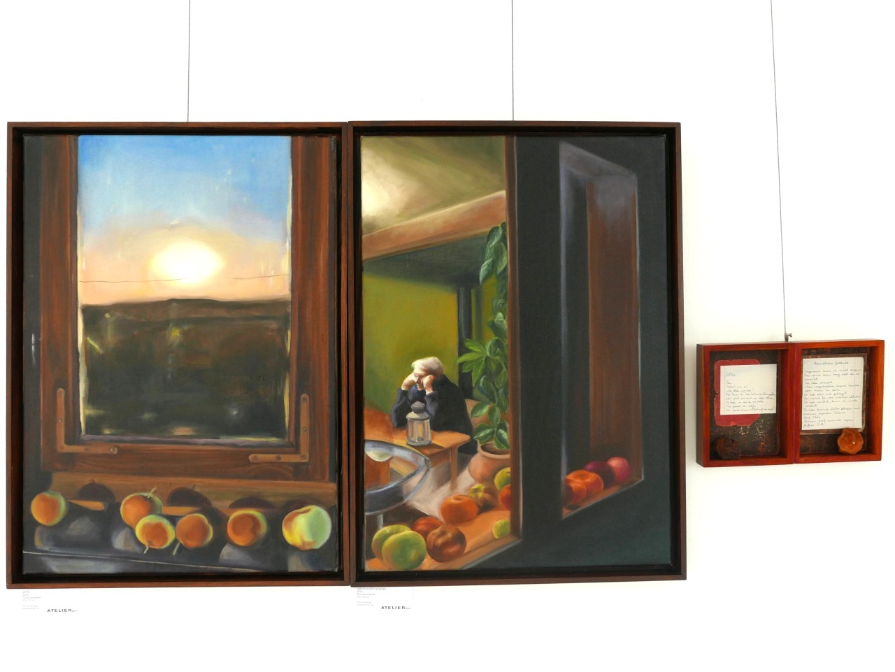 Das Fenster ist bildbestimmend, es entstehen An- und Einsichten durch das Fenster, auch Spiegelungen, die gleichzeitig als Barrikade wirken, die Rückkehr in dies Vergängliche verhindert.